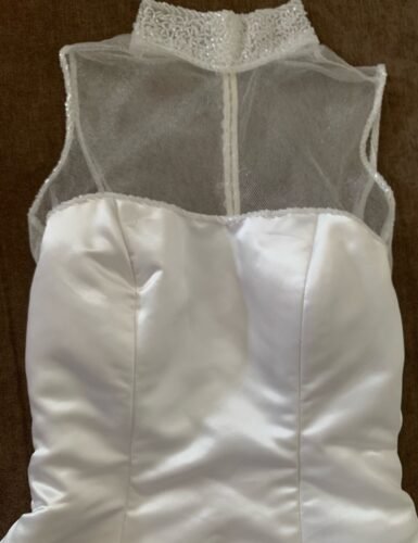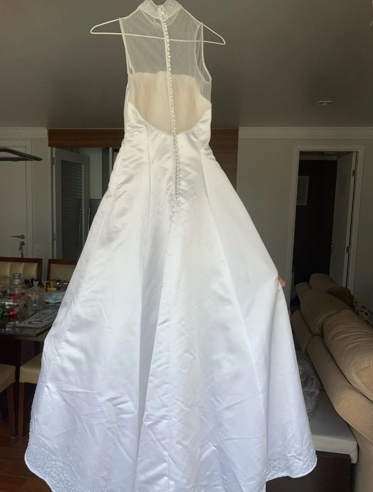 Vestido de noiva lindíssimo branco cetim com bordados na gola nos decote das costas e na barra , modelo gola alta