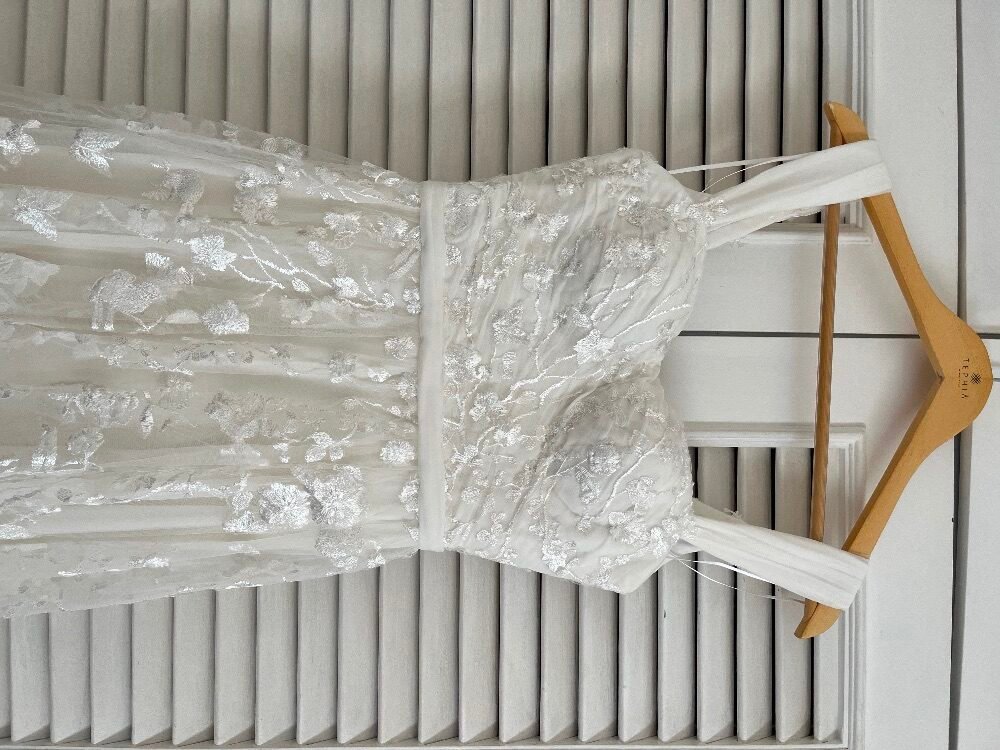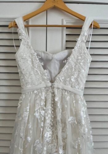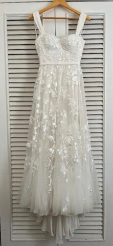 Vestido de noiva confeccionado em 2023 no ateliê Tephiá em São Paulo em excelente estado de conservação. Veste bem tamanhos 36 e 38. Em base de crepe, coberto por georgette de seda e finalizado com tule com aplicação de renda. Acompanha véu, cabide, capa protetora e caixa com laço.