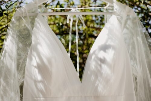Com um design minimalista, ele destaca a beleza da simplicidade. O tecido é fluido, leve e muito confortável, ideal para quem quer se sentir à vontade e linda durante toda a cerimônia e a festa. A transparência suave nas mangas adiciona um toque romântico, enquanto o corte moderno valoriza a silhueta de forma discreta e sofisticada.