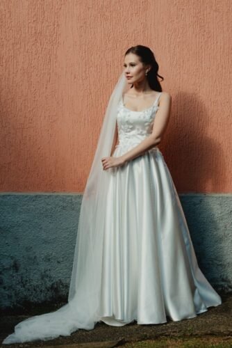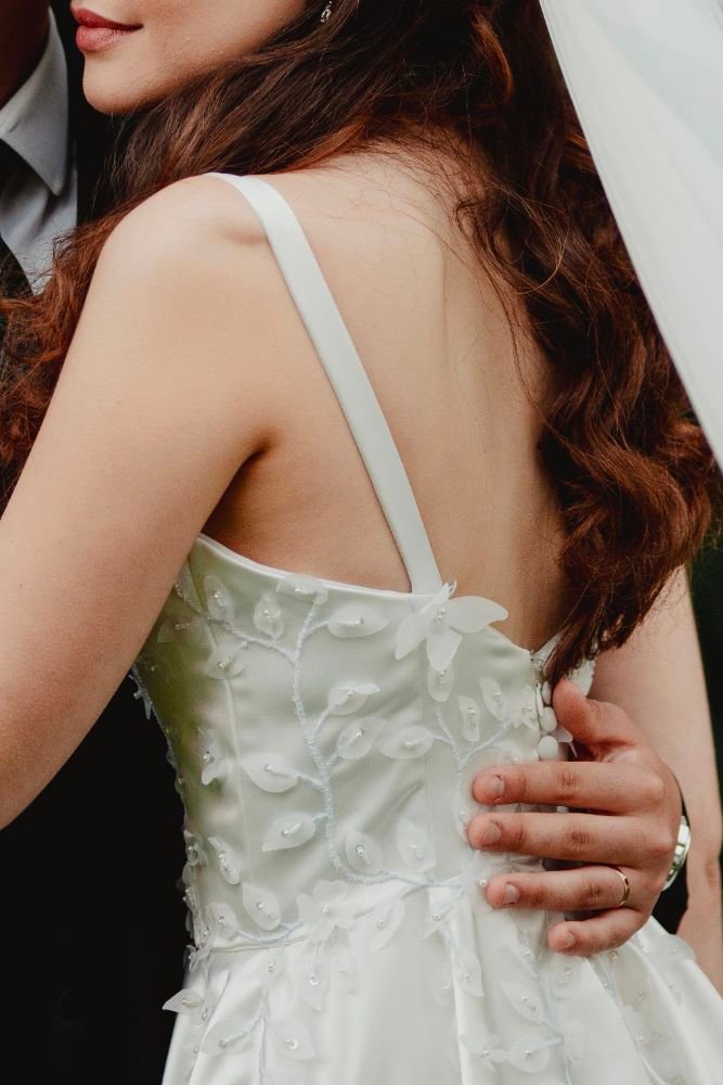Vestido de noiva minimalista com detalhes em 3D