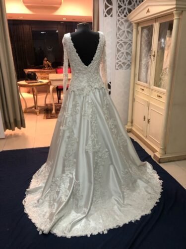 Vestido de noiva princesa, de zibelini, bordado com canutilhos e cristais, com decote nas costas sem saiote e sem véu.