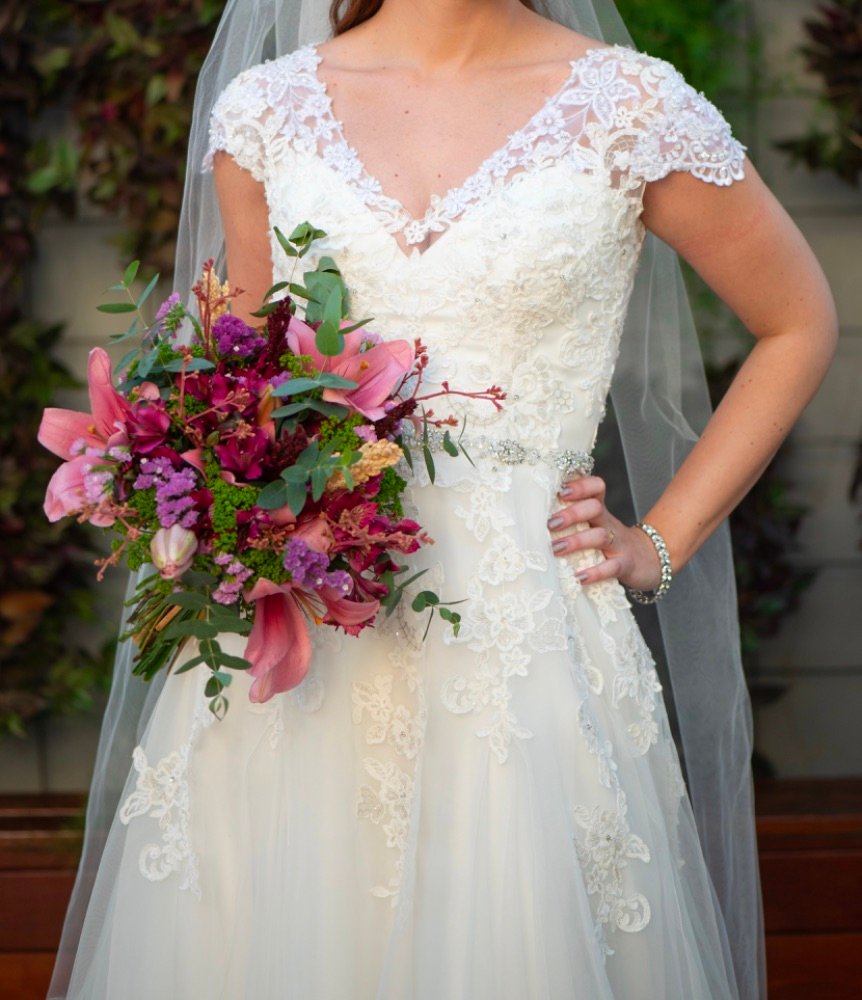 Vestido de noiva em tule e renda, com bordados na cor off white da marca belga Jarice, comprado na loja Casa Amarela de Campinas. Vestido possui a parte superior com aplicação em renda e bordado que vai até a altura do quadril. Possui bordado em pedraria em forma de cinto na cintura e pequenas mangas em renda. As costas são ajustáveis através do trançado e possui bojo no busto. Está em perfeito estado. Acompanha capa de proteção da loja.