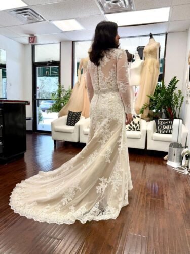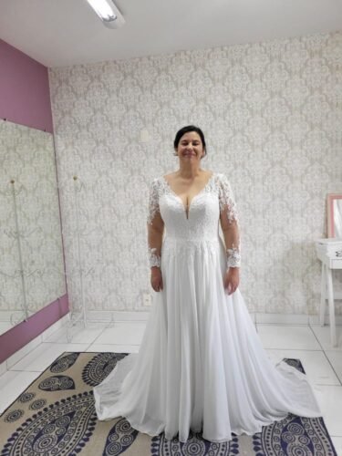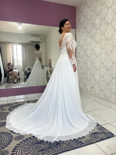 Vestido noiva comprado nos Estados Unidos, tamanho 10 (Estados Unidos)/44 (Brasil), usado apenas uma vez. Em chiffon e renda, com cauda sereia, esta em perfeito estado. Estou em Sao Paulo, Vila Madalena.
